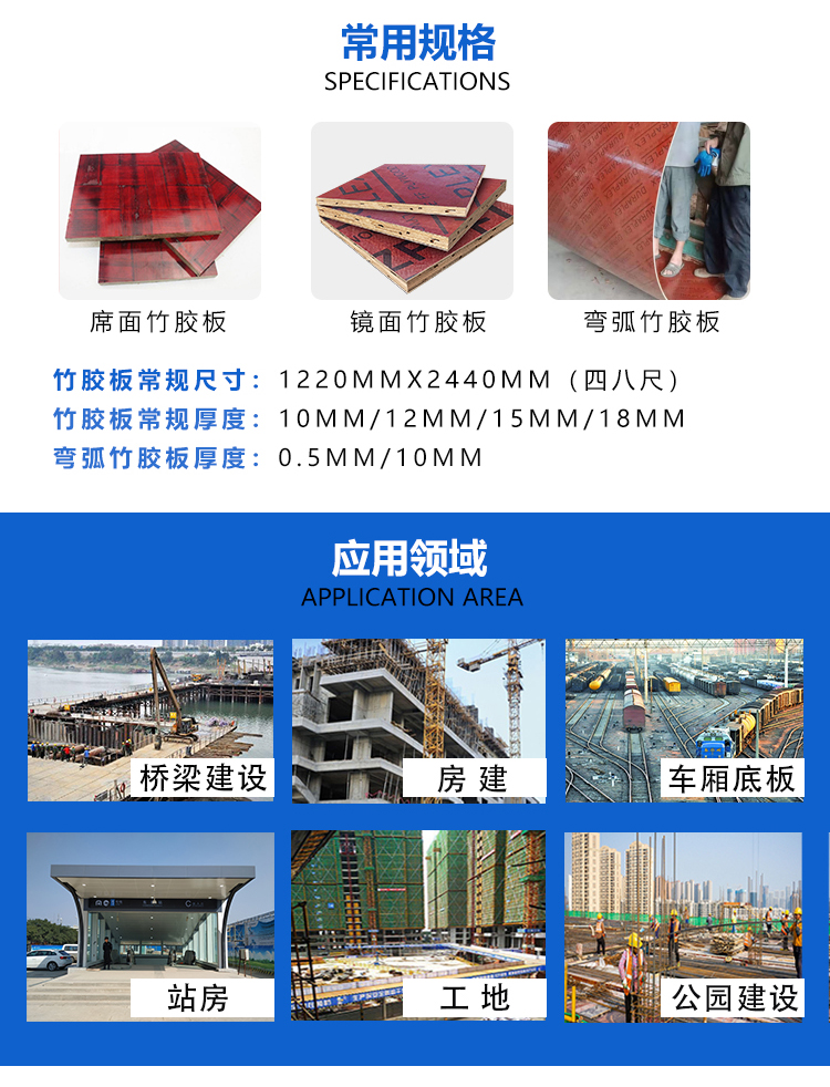 以標(biāo)準(zhǔn)竹簾搭配中簾、薄簾戓厚簾,選用無節(jié)楊木面板和木槳膜紙混合壓制而成。用標(biāo)準(zhǔn)簾、中厚混合簾生產(chǎn)出來的竹膠板具有較好的硬度和亮度,適合對混凝土表面要求高的橋梁工程。竹膠板是以毛竹材料作主要架構(gòu)和填充材料,經(jīng)高壓成坯的建材。竹膠板,是高強(qiáng)覆膜橋梁板,建筑模板,及車廂底板等,竹膠板應(yīng)用廣泛,深受用戶青睞。